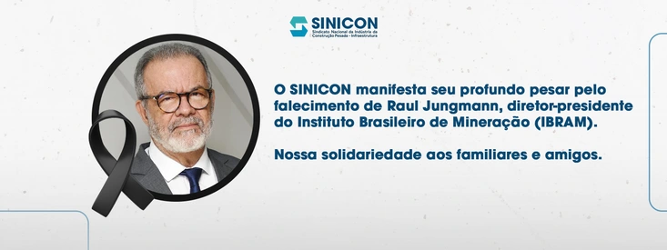 O Sindicato Nacional da Indústria da Construção Pesada - Infraestrutura (SINICON) manifesta seu profundo pesar pelo falecimento de Raul Jungmann, diretor-presidente do Instituto Brasileiro de Mineração (IBRAM).